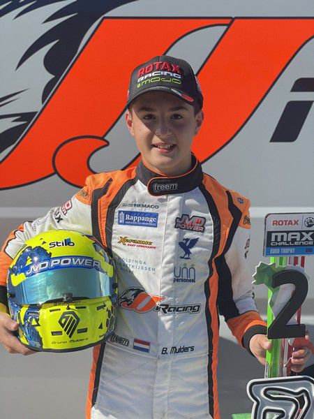 ADRIA – Zijn overstap naar een nieuw kartmerk en kartteam hebben Bruno Mulders een boost gegeven. De dertienjarige coureur uit Bosch en Duin werd afgelopen weekeinde knap tweede tijdens de tweede ronde van de Rotax Max Challenge Euro Trophy. Op het circuit van Adria liet hij in de Junioren-klasse het hele weekeinde een super-pace zien. Dat resulteerde erin dat hij in de beide finales tweede werd en dat hij in de tweede finale de snelste raceronde reed.