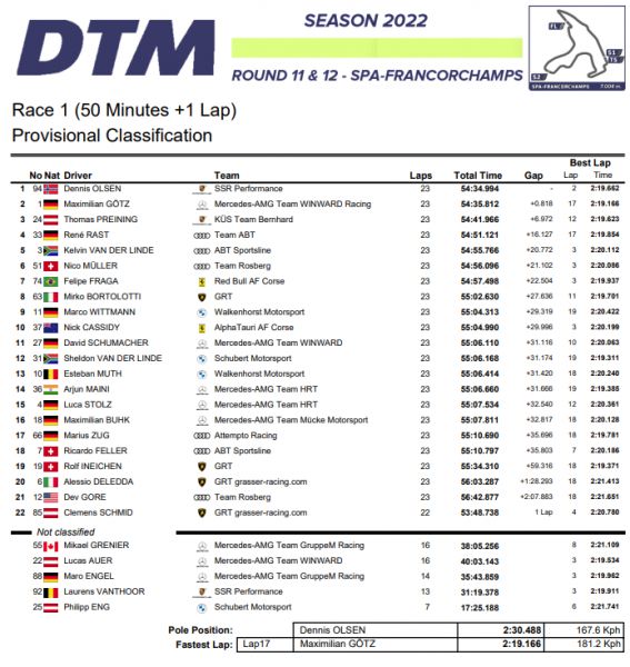 Spa-Francorchamps - Met een start-finish overwinning verzekerde Dennis Olsen zich van de eerste triomf van zijn nog jonge DTM-carrière in de SSR Performance Porsche. De Noor wist in de ochtend met een tijd van 2:30.488 minuten de beste gridpositie in de kwalificatie voor zich op te eisen. Voor Olsen is het de langverwachte eerste DTM-zege na twee tweede plaatsen op de Norisring en de Nürburgring. De tweede en derde plaats op het podium ging naar regerend DTM-kampioen Maximilian Götz (GER, Mercedes-AMG Team WINWARD) en merkgenoot Thomas Preining (KÜS Team Bernhard). Götz startte op de vierde plaats en kon over een raceafstand van 50 minuten plus één ronde twee plaatsen goedmaken. Het is zijn eerste podium dit seizoen. De Oostenrijker Thomas Preining had een goede kans op de overwinning met een goed kwalificatieresultaat als tweede snelste, maar na een touché in de openingsronde viel hij terug naar de negende plaats om daarna alsnog de derde plaats te heroveren. De tweede DTM-race op Spa-Francorchamps begint zondag om 13:30 uur CEST.