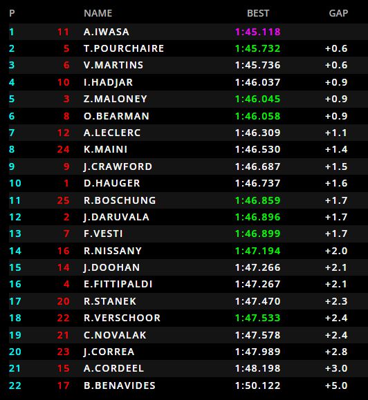 Iwasa, Pourchaire en de gecrashte Martins maken de top drie compleet. Ze houden Isack Hadjar, Zane Maloney, Oliver Bearman en Arthur Leclerc achter zich. Richard Verschoor moet genoegen nemen met de achttiende positie.