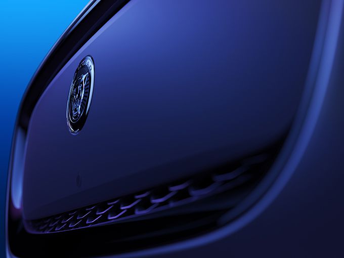 De grille heeft nu een gladde vorm, in opvallend Atlas Grey. Dit vervangt het vorige glanzend zwarte ruitpatroon en zorgt voor een eenvoudiger en schoner uiterlijk van de voorkant van de auto, terwijl het inherent elektrische DNA wordt versterkt. Atlas Grey is ook toegepast op de verticale lamellen aan de buitenkant van de frontopeningen. Een andere detailwijziging is de nieuwe zwart met zilveren Jaguar badge in de grille.