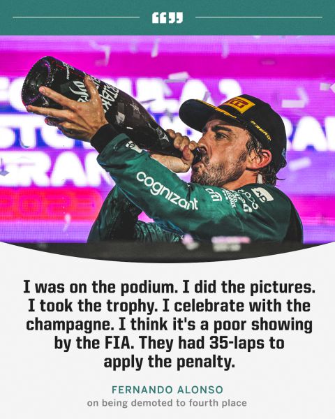 Vooruitlopend op het vonnis van het protest, gaf Alonso toe dat hij sympathie voelde voor George Russell en Mercedes, nadat hem een foto van de Top-3 was geweigerd - voordat zijn podium werd hersteld. Hij zei in een bericht van Express-co: "Nee, het is niet eerlijk voor George, want ik denk dat de Mercedes-sponsors graag op het podium zouden staan. Maar voor ons is het goed, wij hebben (Saudi-gevestigde titelsponsor, red.) Aramco, we hebben de foto en ik denk dat het niet eerlijk is voor George, want als hij echt derde werd in de race, zou hij van het podium moeten genieten en niet ik. Dus ik heb medelijden met George, met de sponsors van Mercedes, met de fans van George. Voor mij heb ik alleen maar geprofiteerd van deze race."
