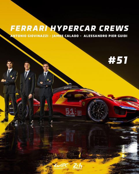 Alessandro Pier Guidi, James Calado en Antonio Giovinazzi vormen de bemanning die de taken zal delen op de auto gemarkeerd met het nummer 51, een van de meest succesvolle in de geschiedenis van Ferrari. Na voor de tweede keer op rij wereldkampioen te zijn geworden (de derde in zijn carričre) in de LMGTE Pro-klasse, gaan de Italiaan Alessandro Pier Guidi, geboren in 1983, en de Brit James Calado, geboren in 1989, samen de uitdaging aan om de lauwerkrans te winnen in de koningsklasse. Het partnerschap, dat bezig is aan zijn zesde seizoen in het wereldkampioenschap, kan bogen op een uniek palmares: niemand vóór hen werd twee keer op rij tot kampioen gekroond in de LMGTE Pro-klasse en geen enkel team won drie lauweren (2017, 2021, 2022). De cijfers van het Italiaans-Britse duo, in 7 seizoenen in het WEC, vertegenwoordigen een ondubbelzinnig visitekaartje: 11 overwinningen en 23 podia uit 39 starts. Het wereldkampioenskoppel zal kunnen rekenen op de snelheid van de Italiaan Antonio Giovinazzi, geboren in 1993, voor het eerst fulltime betrokken bij het wereldkampioenschap endurance na zijn ervaring tijdens de 24 Uur van Le Mans in 2018, waarin hij in positieve zin opviel. Giovinazzi, sinds 2017 betrokken bij Scuderia Ferrari, zal ook in 2023 de rol van reservecoureur blijven spelen.