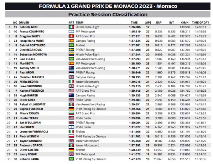 Formule 3: UITSLAG vrije training Monaco