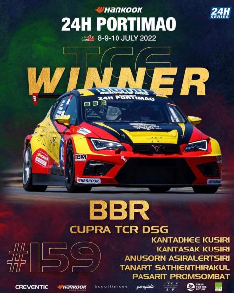 Daardoor nam het zusterteam met de CUPRA TCR (#159, Kantadhee Kusiri/ Kantasak Kusiri/ Anusorn Asiralertsir/ Tanart Sathienthirakul/ Pasarit Promsombat) het stokje over om daarmee na een probleemloze run de race op P1 te voltooien en daarmee aan BBR zijn vierde overwinning van het seizoen e schenken. Tanart Sathienthirakul passeerde de zwart-wit geblokte vlag, waarbij de TCR-winnaar 658 ronden van de 4,652 km lange Autódromo Internacional do Algarve aflegde. Bas Koeten Racing is partner van het BBR-team, zij schreven op hun Fb-pagina: “YESSSS! P1 in TCE/TCR met de CUPRA TCR DSG in 24h Portimao, samen met onze Spaanse partner Monlau. Met 58:52 minuten totale pittijd hadden we veruit de kortste totale pittijd van iedereen: de nummer 2 had 1:25:40 uur. Dat omvat dat de auto thuis perfect geprepareerd was, dat de pitcrew uitmuntend werk heeft geleverd en dat de rijders foutloos gereden hebben. Zo winnen we wedstrijden! YESSSS!”