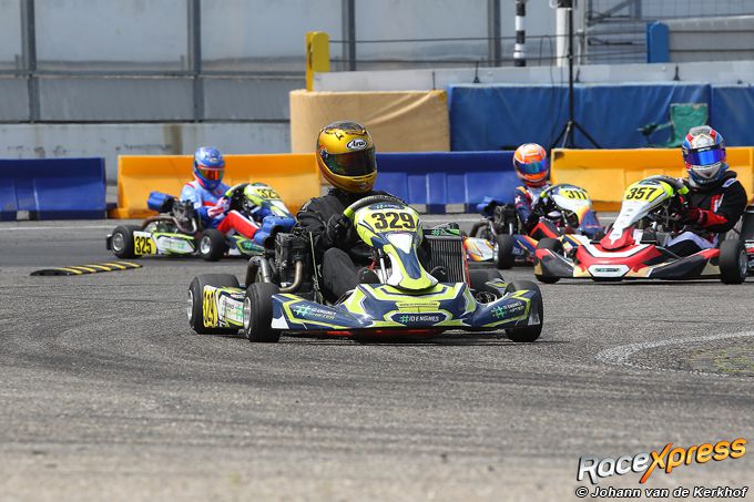"In de derde race was het hetzelfde verhaal. Bij de start kwam ik naast de leider, Jenson de Leeuw, maar ik zat aan de buitenkant en dan red je het net niet. Ik kon hem een paar rondjes goed volgen, maar op een gegeven moment hield ik zijn snelheid niet meer bij. Ik kreeg last van mijn ribben en heup en verkrampte als het ware in mijn kart. Ik heb wel zo hard mogelijk doorgereden, maar het ging zo’n pijn dat ik nog een plekje verloor aan Maikel Schilders.” Uiteindelijk scoorde hij totaal toch nog een knappe tweede positie in de dagstand.