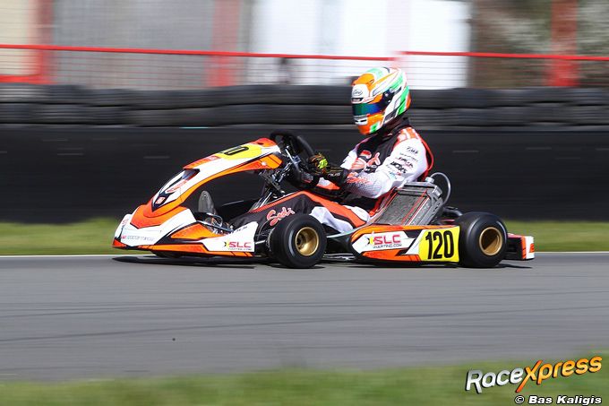 De Fries kwam pas zondagochtend aan op de het circuit. Ondanks de weinige tijd op de baan merkte Kits dat het ontzettend goed liep. “We trainden in de ochtend op nieuwe banden en dat zag er op zich wel goed uit. We hebben hier vrijdag niet getraind, omdat het echt heel slecht weer was. Dus we zijn pas op zondagochtend naar Mariembourg gegaan. De eerste paar rondjes was het natuurlijk een beetje zoeken, maar op een gegeven moment ging het al snel beter en beter. In de vrije training zette ik de snelste tijd neer en in de kwalificatie was ik ook de snelste. Dus mocht ik race 1 vanaf pole position starten.” Kits kreeg al vroeg op de dag het gevoel dat er met zijn gloednieuwe Sodi-kart wat te halen viel op het kartcircuit in Wallonië.