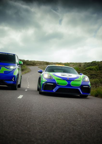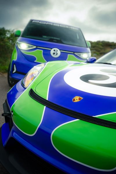 De livery van beide voertuigen is geïnspireerd op een van de meest markante racewagens uit de Porsche-historie: de 917 LH uit 1970, liefkozend de “Hippie” genoemd. Deze long-tail versie van de legendarische 917 was speciaal ontwikkeld voor Le Mans en haalde snelheden tot wel 385 km/u. De psychedelisch ogende paarse lak met groene en witte accenten maakte de auto tot een visueel icoon, net als zijn indrukwekkende prestatie: een tweede plaats in de regenachtige en memorabele 24 uur van Le Mans in 1970 in handen van Gérard Larrousse en Willi Kauhsen. De nieuwe livery van de 718 Cayman GT4 Safety Car en de ID. Buzz (inclusief hetzelfde startnummer 3) is een eerbetoon aan deze kleurrijke geschiedenis.