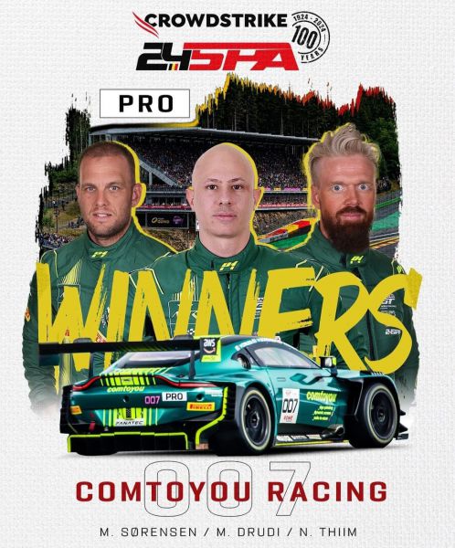 Voor tweevoudig FIA GT World Endurance-kampioen Thiim en drievoudig wereldkampioen Sørensen, binnen de sport liefkozend bekend als de 'Dane Train', betekent de overwinning de eerste keer dat het duo als teamgenoten in dezelfde auto een overall 24 uursrace wint, ondanks dat ze samen drie klasseoverwinningen in de 24 uur van Le Mans hebben behaald.