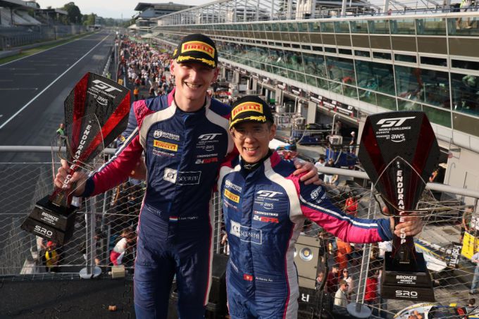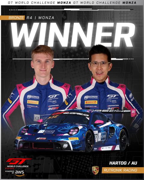 Loek Hartog (l) maakte er twee uitgeputte Nederlandse coureurs van, nadat hij samen met Antares Au (r) de Bronze Cup-overwinning voor Rutronik Racing veiligsteldeLoek Hartog maakte er twee uitgeputte Nederlandse coureurs van, nadat hij samen met Antares Au de Bronze Cup-overwinning voor Rutronik Racing veiligstelde. De twee coureurs eindigden op een fantastische tiende plaats in het algemeen klassement. "Dit is mijn eerste keer op Monza en mijn eerste seizoen in de GT World Challenge Europe", zei een opgetogen Au. "Ik heb een geweldig team en een fantastische bijrijder."