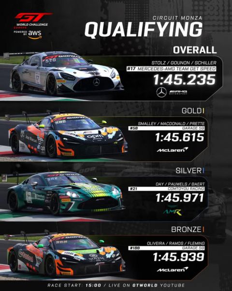 Mercedes-AMG blijft dominant in Monza. Na beide pre-event tests op vrijdag te hebben geleid en de vrije training op zaterdagochtend volledig te domineren, behield het Duitse merk zijn positie aan kop door op zaterdagmiddag als eerste en tweede te eindigen in de pre-kwalificatie. Opnieuw was het Jules Gounon die de snelste ronde neerzette – een 1:46.003 – en GetSpeed daarmee bovenaan het klassement zette. "Tot nu toe presteren we goed. Dat is onze belangrijkste focus", aldus de man uit Andorra. "We hebben hard gewerkt met twee testdagen, en het werk dat we in de winter hebben verricht, werpt zijn vruchten af." Gounon maakte echter duidelijk dat het op zaterdag alleen om de training ging; zondag is wat telt!