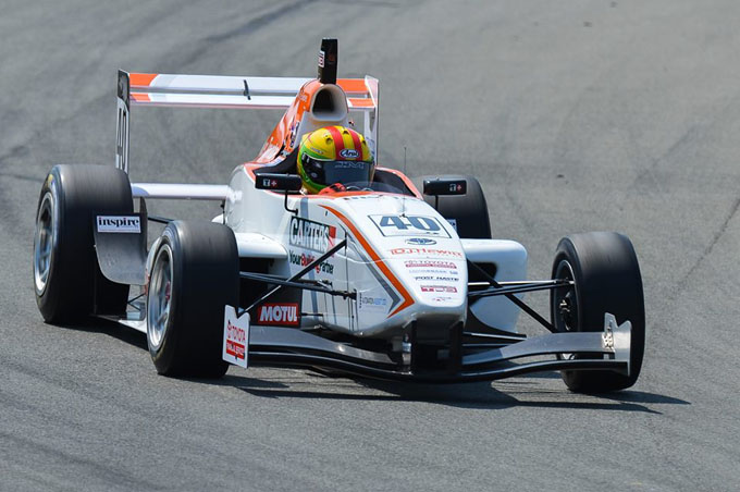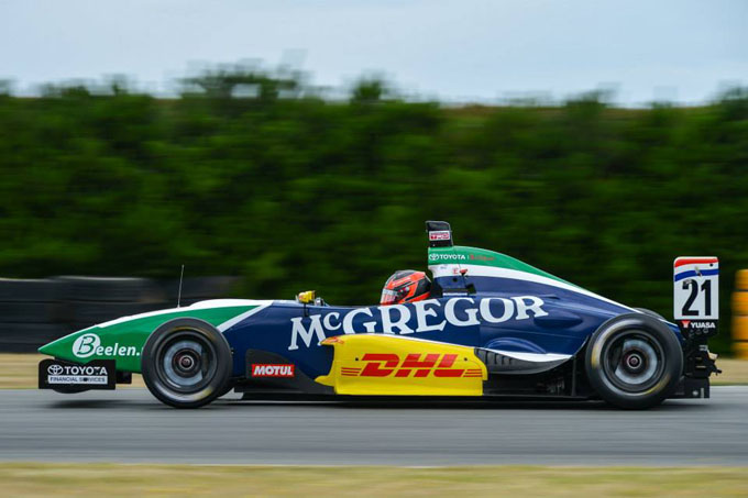 De eerste race van het weekend stond ‘s middags op de planning. Munro had een goede start maar achter hem ging het mis. Macauley Jones kwam in aanraking met Matteo Ferrer. Beiden crashten over het gras terug de baan op waarna ze geraakt werden door andere coureurs. Naast Jones en Ferrer waren Michael Scott, Denis Korneev, Martin Kodric en Andrew Tang de uitvallers na het slagveld in de eerste bocht. De schade bleef beperkt tot beschadigde neuzen, achtervleugels en verbogen ophangingen. Munro en Schothorst hadden geen last van de ongevallen en reden aan kop. Schothorst kon echter geen bedreiging vormen voor Munro. De Nieuw-Zeelander kon wegrijden bij de Nederlander en won uiteindelijk met meer dan drie seconden voorsprong. In de slotfase van de race haalde Martin Rump op een spectaculaire manier Ryan Tveter in. De snelle Est reed op het rechte stuk achter de Amerikaan maar door erg laat te remmen kon hij hem voorbij steken.