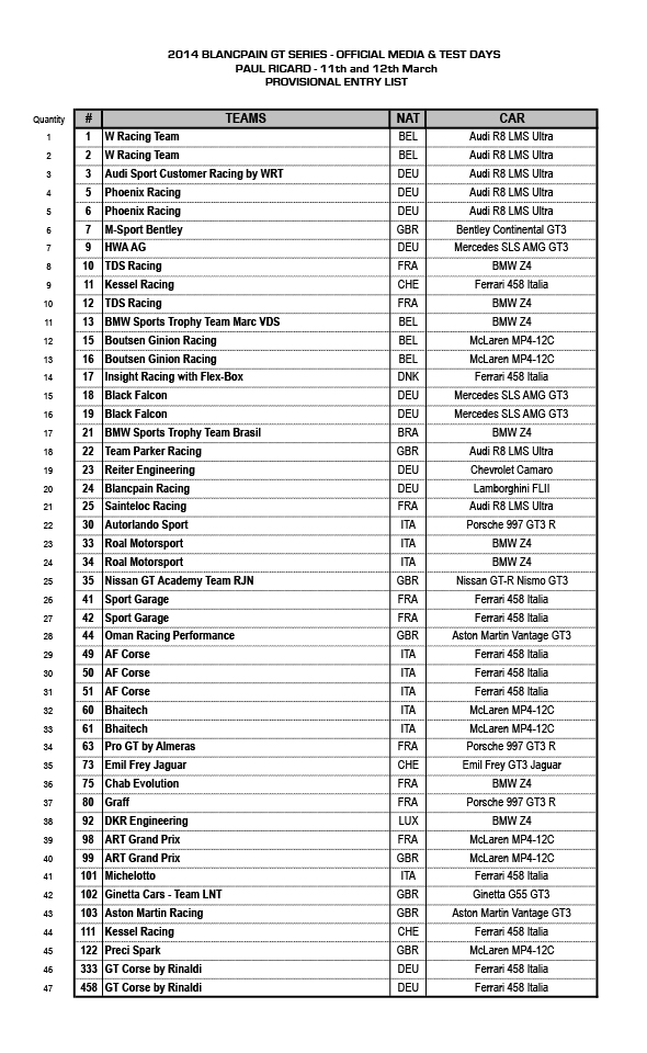 Op 11 en 12 maart staan er 24 teams en 47 GT3-bolides klaar om deel te nemen aan de officiële testdagen van de Blancpain GT Series op het circuit van Paul Ricard. Liefst twaalf verschillende merken zijn vertegenwoordigd in Le Castellet. De test vindt plaats voordat het seizoen een maand later aftrapt op het circuit van Monza.