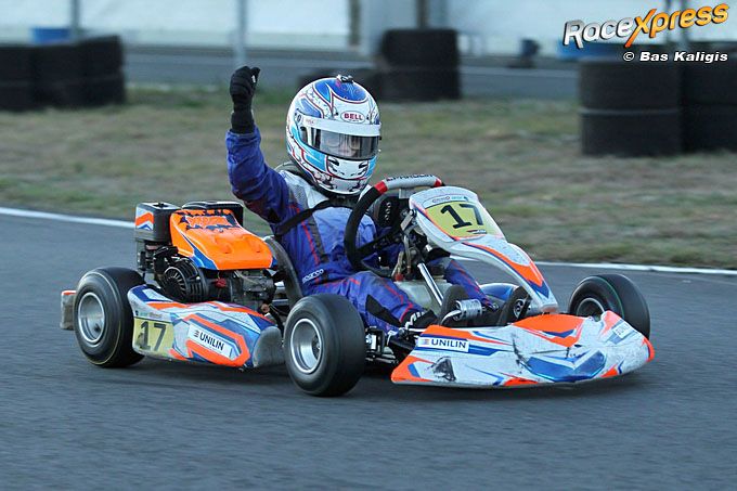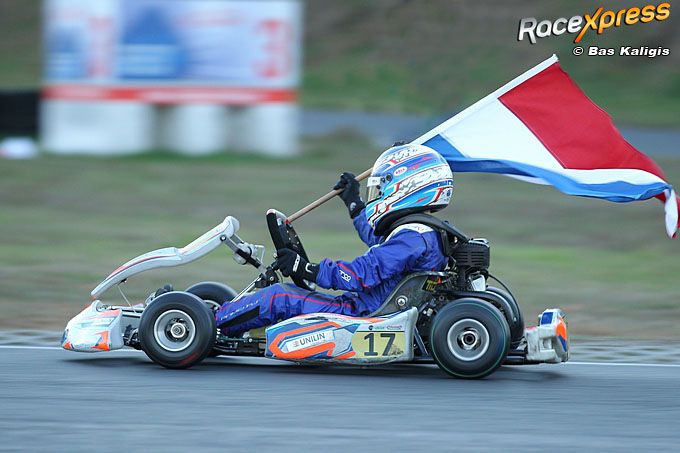 EINDHOVEN - Even vreesde hij nog voor de titel na een mindere tweede race in Eindhoven, maar aan het eind van de dag kon karter Devyan Roest zijn handen in de lucht steken: Nederlands kampioen in de Parolin Rocky-klasse! Voor het elfjarige racetalent uit Hoofddorp was het zijn eerste titel. Hij was er na afloop van de zesde ronde van het Nederlands kampioenschap viertakt maar wat trots op. Zeker omdat het pas zijn eerste volledige seizoen als wedstrijdkarter is.