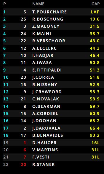 Pourchaire scoorde vrijdagavond dominante wijze de pole position en verzilverde deze tijdens de hoofdrace. Ralph Boschung won de sprintrace en mag opnieuw mee naar het podium nadat hij vanaf P10 startte. Zane Maloney won in zijn Carlin maar liefst vijftien positie en eindigde op de derde positie. Kush Maini en Richard Verschoor eindigde net naast het podium.