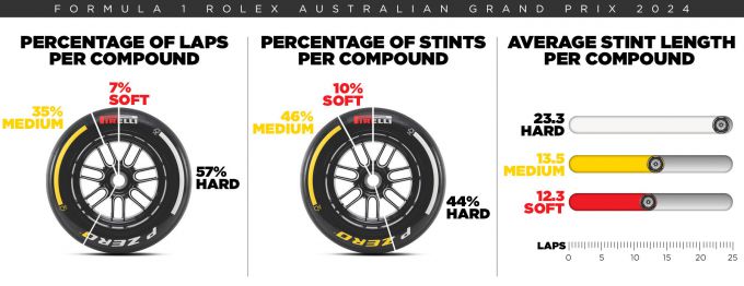 Het trio van compounds is hetzelfde als vorig jaar: C2 als Hard, C3 als Medium en C4 als Soft. De laatste twee werden afgelopen weekend in Melbourne ingezet, terwijl de eerste eind februari uitgebreid werd getest tijdens een driedaagse test in Bahrein. Men moet er echter rekening mee houden dat alle compounds anders zijn dan vorig jaar. Vooral de C2 is zachter en komt daardoor dichter bij de C3 te liggen dan voorheen.