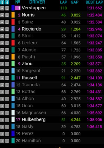 Verstappen reed vandaag al 117 rondjes, maar is samen met George Russell de enige die de hele dag rijdt. Russell maakte in de ochtendsessie niet veel meters, maar doet dit nu wel. Hij heeft inmiddels 90 rondjes gereden.