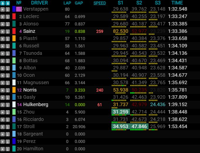 Het eerst halfuur in de middagsessie zag weinig actie. Carlos Sainz Was in zijn Ferrari de eerste coureur die wat rondjes reed op het circuit. Max Verstappen reed het afgelopen uur veertien rondjes, Carlos Sainz reed er negentien. Fernando Alonso reed alleen een installatieronde en spendeerde de meeste tijd binnen. Op het moment van schrijven maakte Logan Sargeant zich op voor zijn eerste meters van het seizoen.