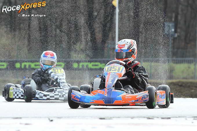 Ook tijdens de eerste race was de baan nat en dat zorgde voor een boeiend gevecht tussen Dylan en René Lammers (zoon van ex F1-coureur Jan Lammers, red.). “Ik moest echt hard knokken”, bekende de talentvolle Noord-Hollander. “We zijn in de eerste paar rondes samen weggereden. Aan het einde van het rechte stuk probeerde na de start René me op een gegeven moment uit te remmen, maar hij schoot door en zo kon ik hem via de binnenkant voorbij. Daarna heb ik de rest van de race op kop gereden.”