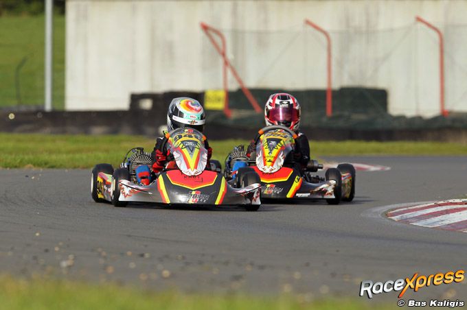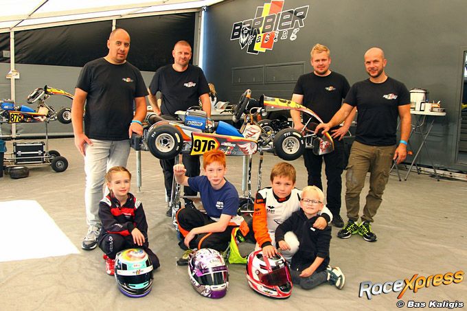 Roselyn Heinicke (8) kart als enige meisje tussen de jongens in de Mini-Rookie; in de slipstream van teamgenoot Levin Barbier naar voren