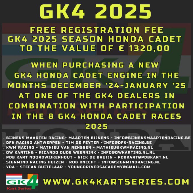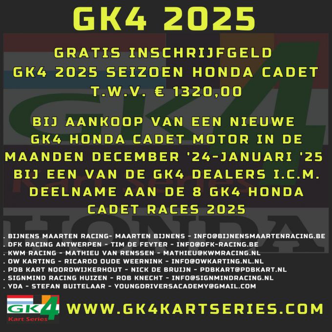 Indien u in de maanden december 2024 - januari 2025 een GK4 Honda Cadet motor aanschaft bij een van de onderstaande GK4 dealers krijgt u de inschrijfbedragen – ter waarde van € 1320,00 - voor de acht seizoensraces van ons gratis.