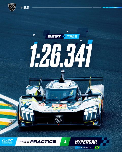 - De #93 Peugeot TotalEnergies 9X8 voert de tijdenlijst aan tijdens een vochtige FP1-sessie op Interlagos, terwijl Nico Mueller de beste tijd van 1m26.341s neerzet, in een sessie die met 40 minuten wordt ingekort vanwege een rode vlag voor een ongeval van de #78 Akkodis ASP Lexus LMGT3-auto.