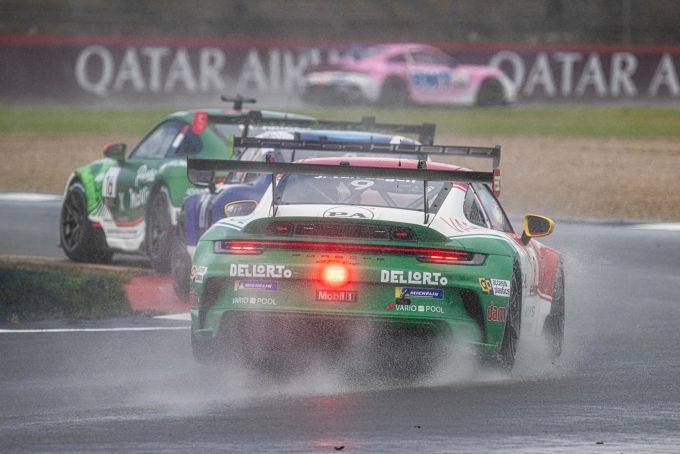 Een dag later zorgden de regengoden wel voor extra spektakel. Eerst werd de start van de race uitgesteld door het vele water, daarna volgden enkele ronden achter de safety car en een rollende start. “Tot kort voor de start leek er nog niets aan de hand. Alle Porsches stonden op slicks, waarna snel naar regenbanden moest worden gewisseld.”